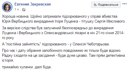 "За версією слідства, був залучений безпосередньо до викрадення Луценко і Вербицького з Олександрівської лікарні в ніч 21-го січня 2014-го року. А "постійна зайнятість" підозрюваного - у Олексія Чеботарьова", - пише на своїй сторінці в Facebook адвокат Євгенія Закревська.