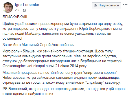 За його словами, Сергій Мисливий в 2014 році нібито виконував роль "заступника командира" групи "тітушек", який викрали і вбили Юрія Вербицького.
