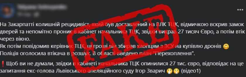 Нагадаємо, нардепка писала, буцімто колишній ув'язнений, якого доставили на ВЛК ТЦК, відмичкою відкрив замок дверей та непомітно проник у кабінет начальника ТЦК. Звідти рецидивісту начебто вдалося викрасти 27 тисяч євро. А потім втекти через вікно.