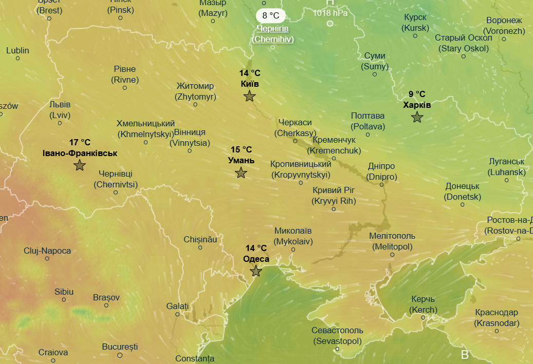У п'ятницю, 17 квітня, вночі у західних областях, а вдень в центральних та північних областях пройдуть невеликі дощі. Вночі синоптики прогнозують від +3 до +9 °С, денний максимум складе +13…+18 °С. Прохолодніше буде у західних та північно-східних областях — в межах +8…+13 °С.