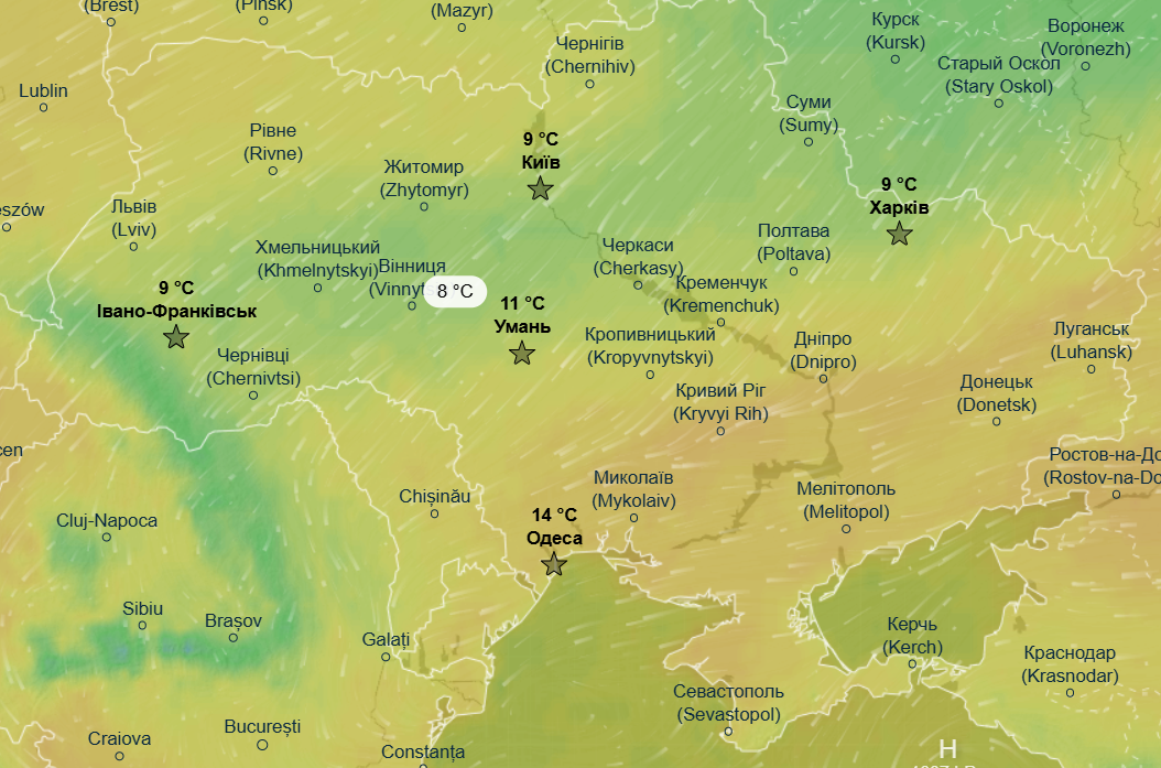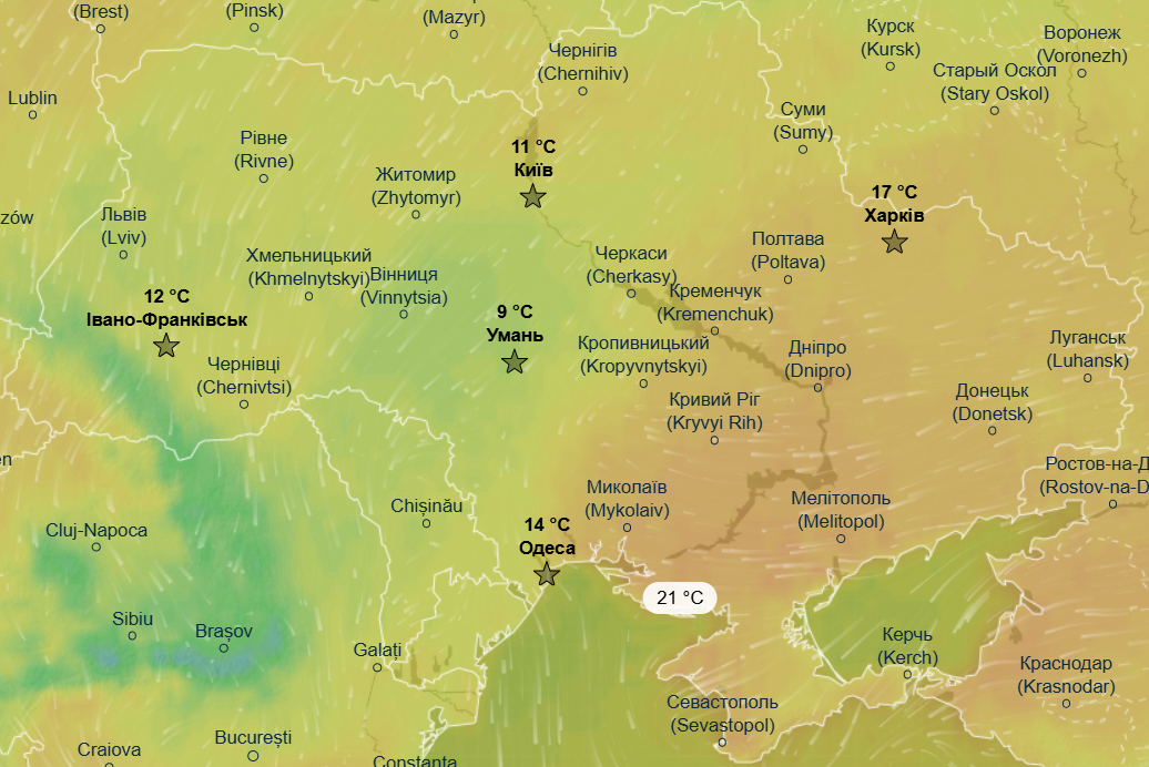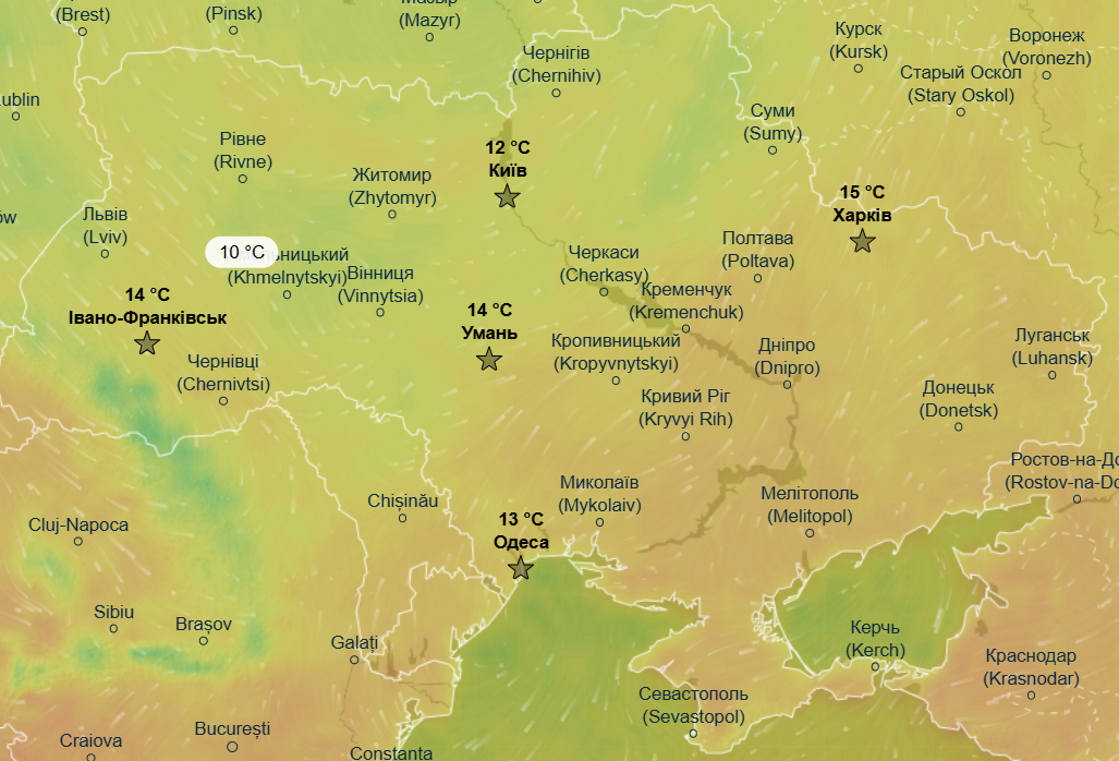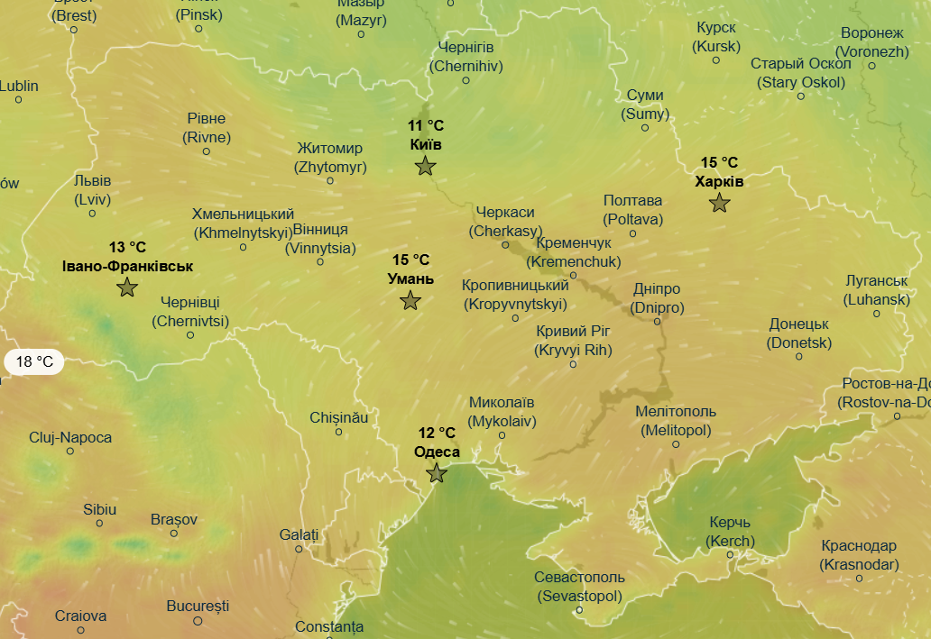 У середу, 15 квітня, вночі можливі невеликі дощі у східних областях України, а вдень — на крайньому заході. Вночі синоптики прогнозують від +2 до +7 °С, заморозки до –2 °С можливі в ніч на середу у західних та північних областях. Вдень термометри піднімуться до +12…+17 °С на більшій території країни, прохолодніше буде у східному регіоні та деяких північних та центральних областях — до +7…+12 °С.