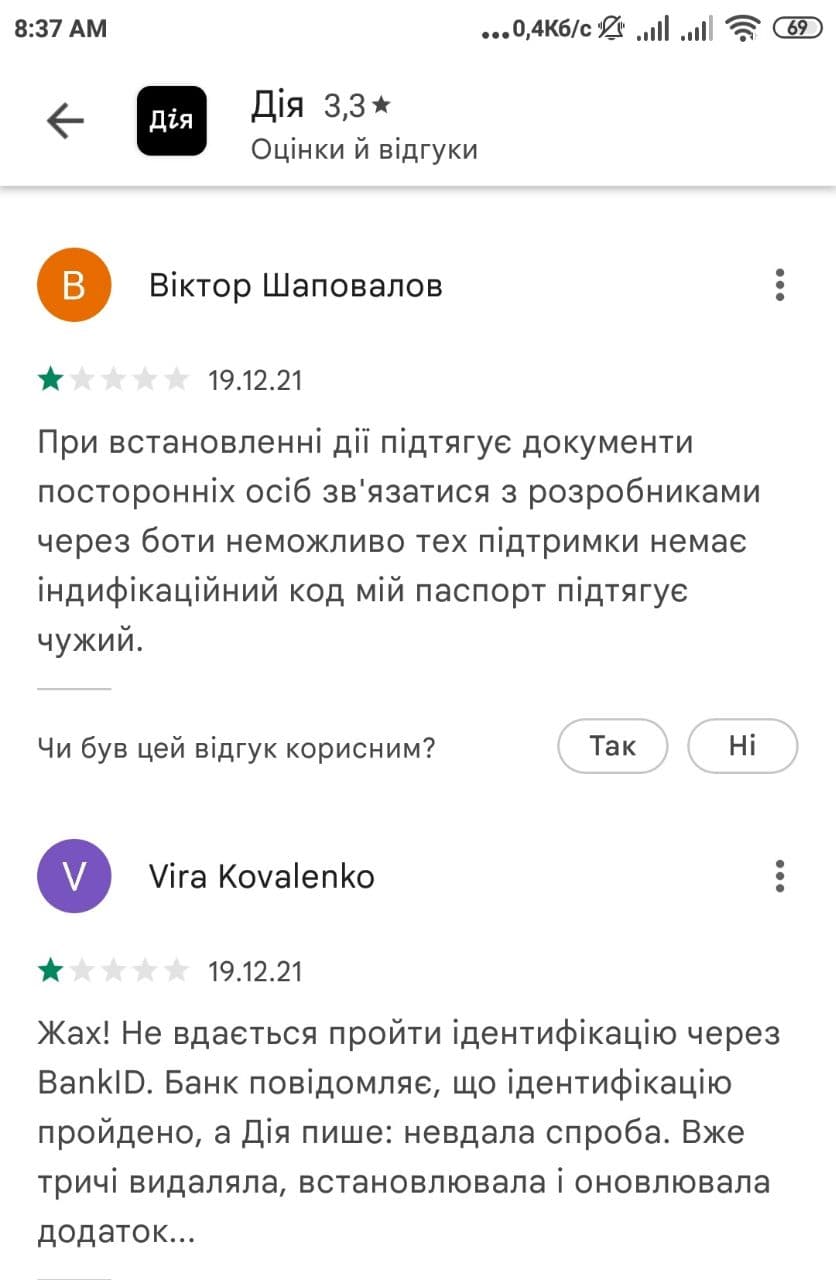 Одна з користувачок пише, що після оновлення вона не може авторизуватися в "Дії". Ще один українець скаржиться, що при установці додаток підтягує дані сторонніх людей, а зв'язатися з розробниками для вирішення проблеми - неможливо.