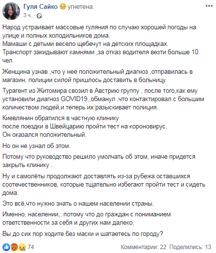 Сайко також наводить ряд кричущіх фактів про безвідповідальну, а часом і відверто злочинну, поведінку українців під час оголошеного в країні карантину, як захисного засобу проти поширення вірусу COVID-19.