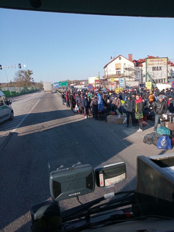 На пропускному пункті Ягодин - Дорогуськ на польській стороні люди вишикувалися, щоб потрапити на батьківщину. Пройти пішки там вони не можуть, тому чекають на транспорт, щоб проїхати.