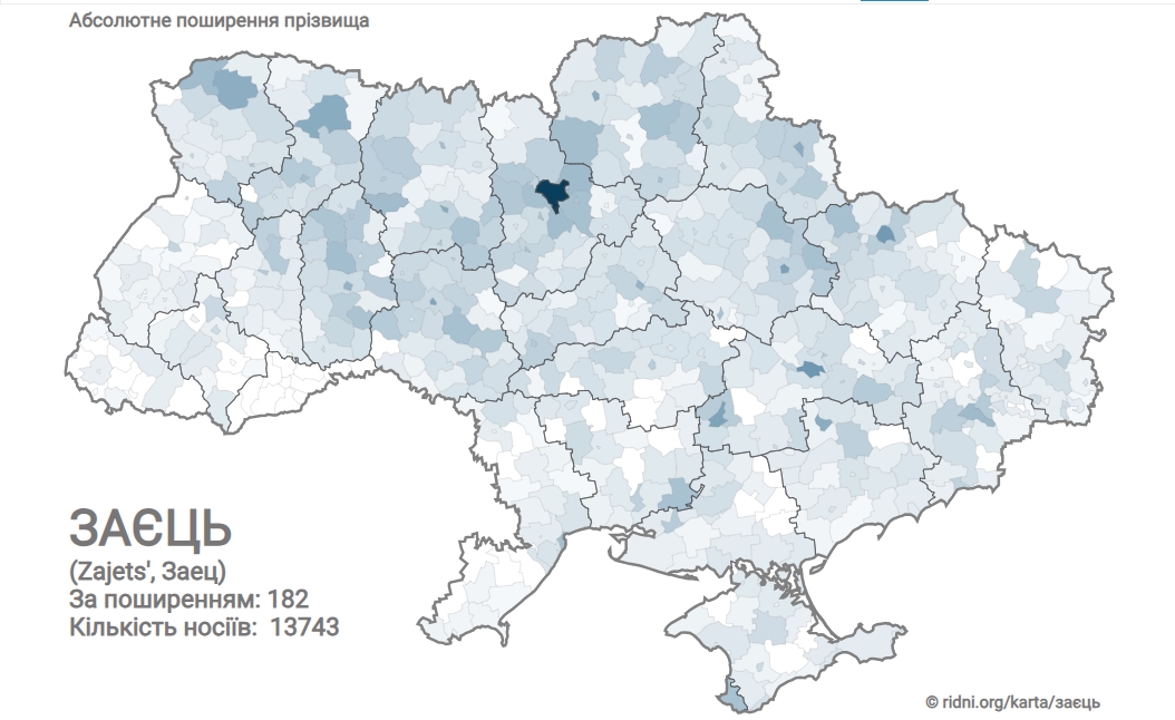 Прізвище Заєць налічує 13 743 носії в Україні. За поширенням посідає 182 місце. Найчастіше зустрічається на Наддніпрянщині. Поселення компактного проживання: Київ (1176), Дніпро (214), Харків (203) Полтава (177), Кривий Ріг (167). Найпопулярніші імена: Олександр, Тетяна.