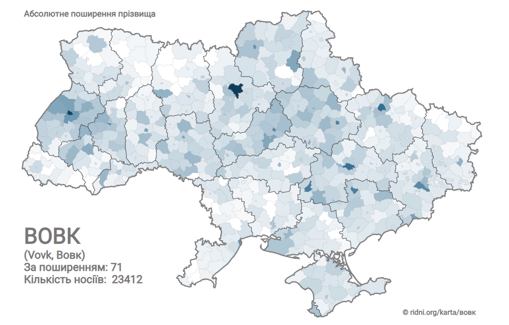 Прізвище Вовк налічує в Україні 23 412 носіїв. За поширенням посідає 71 місце. Найчастіше зустрічається на Наддніпрянщині. Поселення компактного проживання: Київ (1325), Львів (1018), Харків (475), Дніпро (455), Кривий Ріг (377). Найпопулярніші імена: Олександр, Тетяна.
