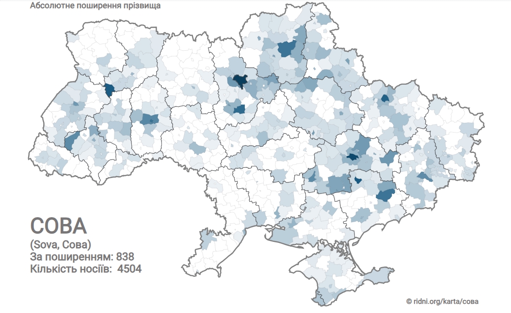 В Україні прізвище Сова налічує 4504 носії. За поширенням посідає 838 місце. Найчастіше зустрічається на Волині. Поселення компактного проживання: Київ (274), Дніпро (200), Запоріжжя (129) Харків (117), Хмельницький (95). Найпопулярніші імена: Олександр, Наталія.