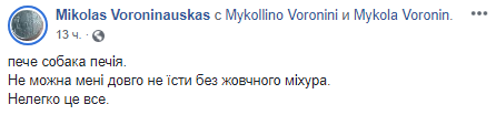 "Пече собака печія. Не можна мені довго не їсти без жовчного міхура. Нелегко це все", - написав Воронін.