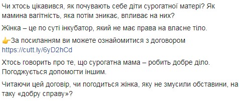 Кулеба стверджує, що жінка після підписання "договору" потрапляє в рабство. Вона після народження дитини не може його побачити, дізнатися про нього. Також жінка не може дізнатися і сім'ю, в до віді потім буде жити народжений нею дитина.