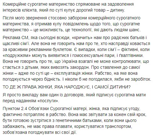 "Реклама сурогатного материнства, яка сьогодні всюди," кричить "нам про радісних батьків і щасливих сім'ях. Але вона не говорить нам про те, хто насправді ховається за красивим рекламним буклетом. Є випадки, коли сім'ї - фіктивні, коли" подружжям " можуть виявитися і гомосексуальні пари, і насильники. Вона не говорить про те, що Україна взагалі не може контролювати, що відбувається з дітьми, яких вивозять за кордон. про ставлення до самої жінки - адже, по суті, це - експлуатація жінки. Рабство, на яке вона погоджується через бідність. І ніколи б не погодилася, якби не заробіток ", - написав Кулеба.