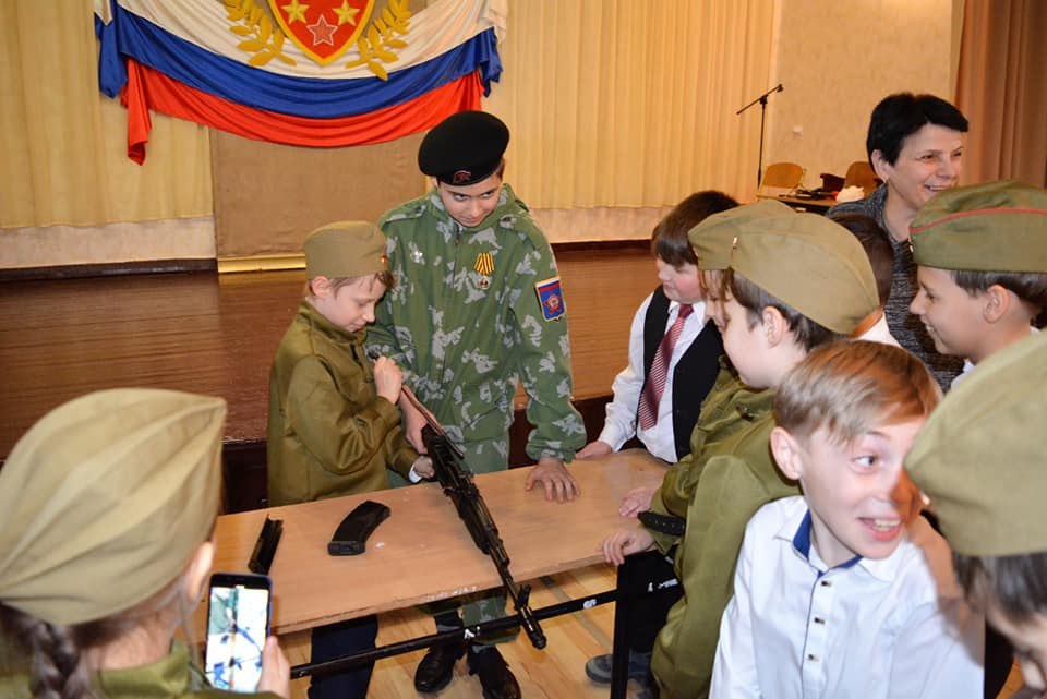 Діти, одягнені в пілотки марширували і співали пісню про "свято" і "захисників", тримаючи в руках фото бойовиків. А на стіні розмістили напис "Виховуємо патріотів. 23", виконаного в кольорах триколора "ДНР".