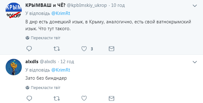 При цьому користувачі відзначили, що кримських окупантів мабуть зачепило, що в ДНР є своя мова, а в Криму немає.