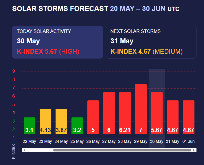 У п'ятницю, 30 травня, експерти прогнозують магнітну бурю червоного рівня з К-індексом 5,67, а в наступні дві доби її потужність знизиться до 4,67, що також є високою. Варто звернути увагу, що усі прогнози вчених є попередніми, оскільки сонячна активність дуже мінлива і ситуація може змінюватися навіть до декількох разів на добу.