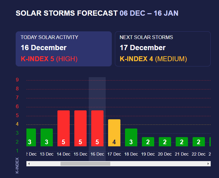 Новий тиждень розпочався з сильної магнітної бурі з К-індексом 5, вплив якої продовжиться і в понеділок, 16 грудня.