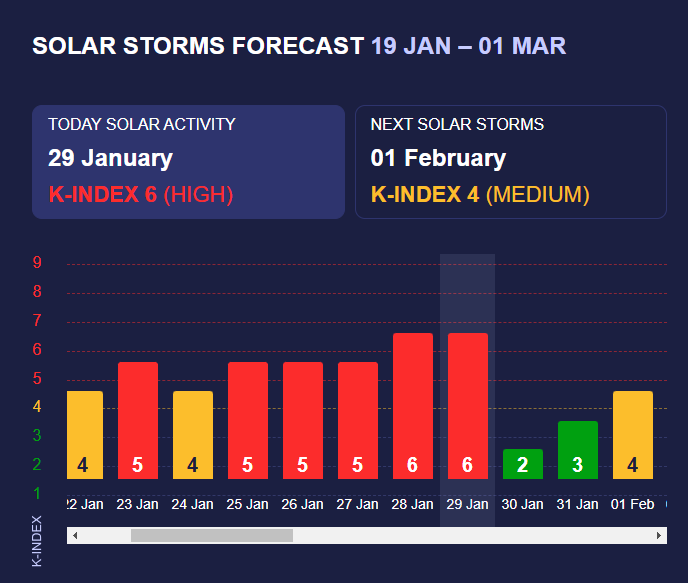 У середу, 29 січня, сила впливу Сонця вимірюватиметься відповідно до К-індексу 6 (червоний рівень). Він відповідає сильній магнітній бурі, яка здатна впливати на самопочуття людей.