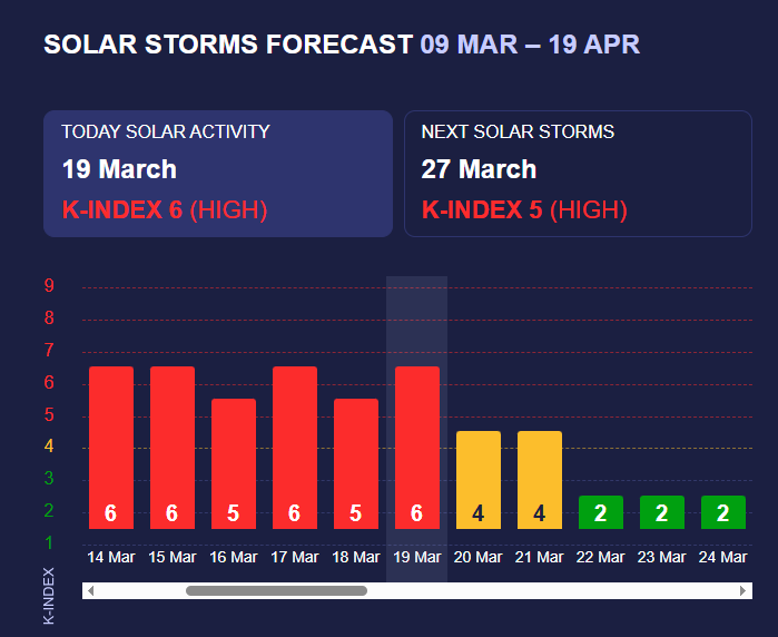 У середу, 19 березня, Землю знову атакувала 6-бальна (з 9 можливих) магнітна буря, яка вже тероризує нашу планету 12-тий день поспіль.
