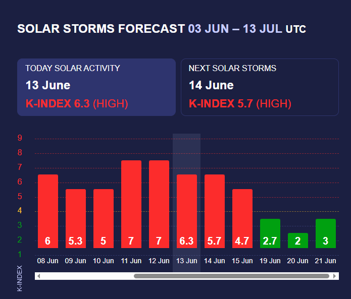 У п'ятницю, 13 червня, експерти зафіксували магнітну бурю з К-індексом 6,3, що є досить високим рівнем. На вихідних її потужність дещо знизиться – 14 червня до 5,7 бала і 15 червня – до 4,7 бала (з 9 можливих). Варто зауважити, що експерти не дають довгострокового прогнозу коливань геомагнітного поля Землі, оскільки сонячна активність дуже мінлива і ситуація може змінюватися навіть до декількох разів на добу.