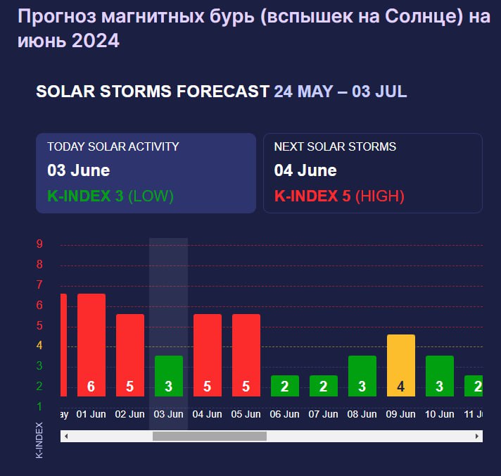 Вчені повідомляють, що мінімальна сонячна активність протримається включно до 8 червня, але вже у неділю, 9 червня, очікуються невеликий геомагнітний шторм 4 балів.