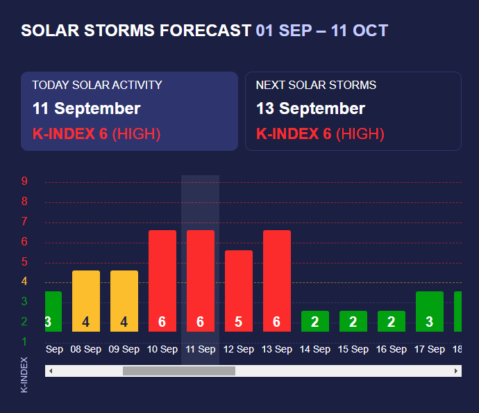 З 10 по 13 вересня триватиме буря К-індексу 6, яка вважається бурею червоного рівня. Такі бурі можуть спричиняти збої в роботі супутників, GPRS, мобільного зв'язку, а також в електромережах. Магнітні бурі такої сили можуть впливати на самопочуття значної кількості людей на планеті.