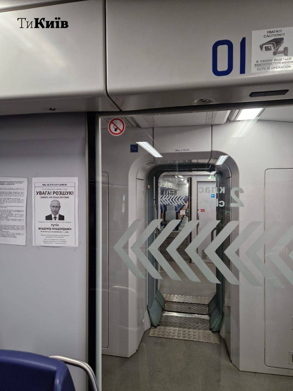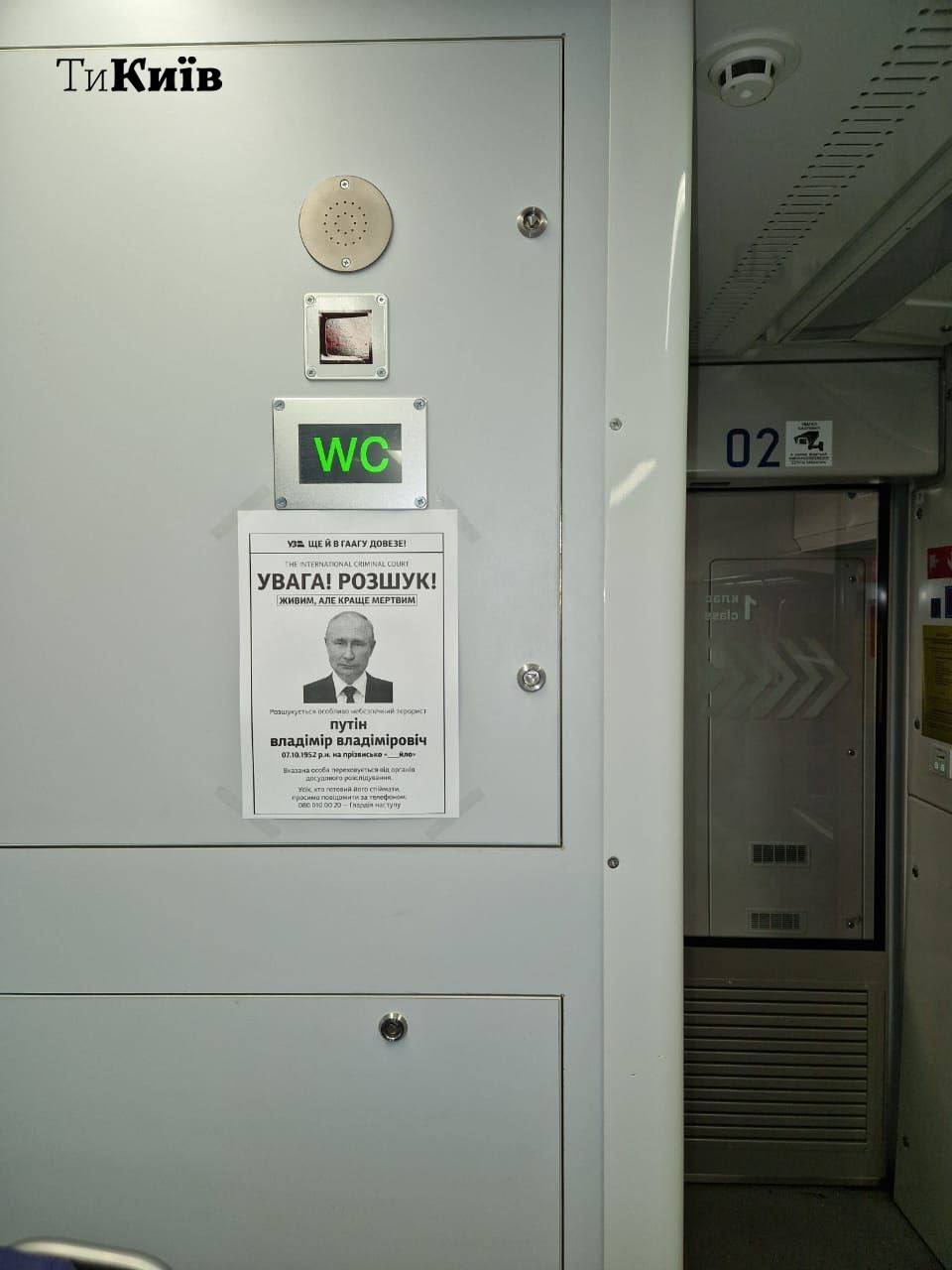 В електричках "Укрзалізниці" у Києві, Львівській та Харківській області вивісили оголошення про "розшук небезпечного терориста" - російського президент Володимира Путіна, обвинуваченого у військових злочинах Міжнародним кримінальним судом у Гаазі.