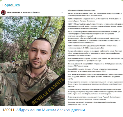 180911 ідентифікованим загиблим у списку став Абдрахманов Михайло Олександрович, (загинув 18 січня 2026 року).