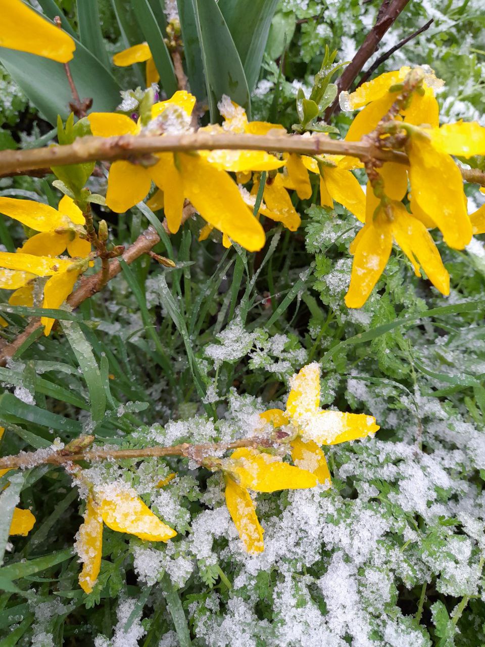На світлинах видно, як чималий шар снігу вкрив уже розквітлі кущі та дерева.
