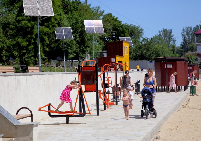 Раніше тут облаштували хвилеріз, замінили пісок, побудували пандус, встановили тіньові навіси, роздягальні, спортивні тренажери, медичний пункт. Останніми удосконаленнями стало нове освітлення, яке буде працювати за рахунок сонячної енергії. Крім того, на пляжі готовий до роботи спеціальний підйомник - ліфт для людей з особливими потребами.
