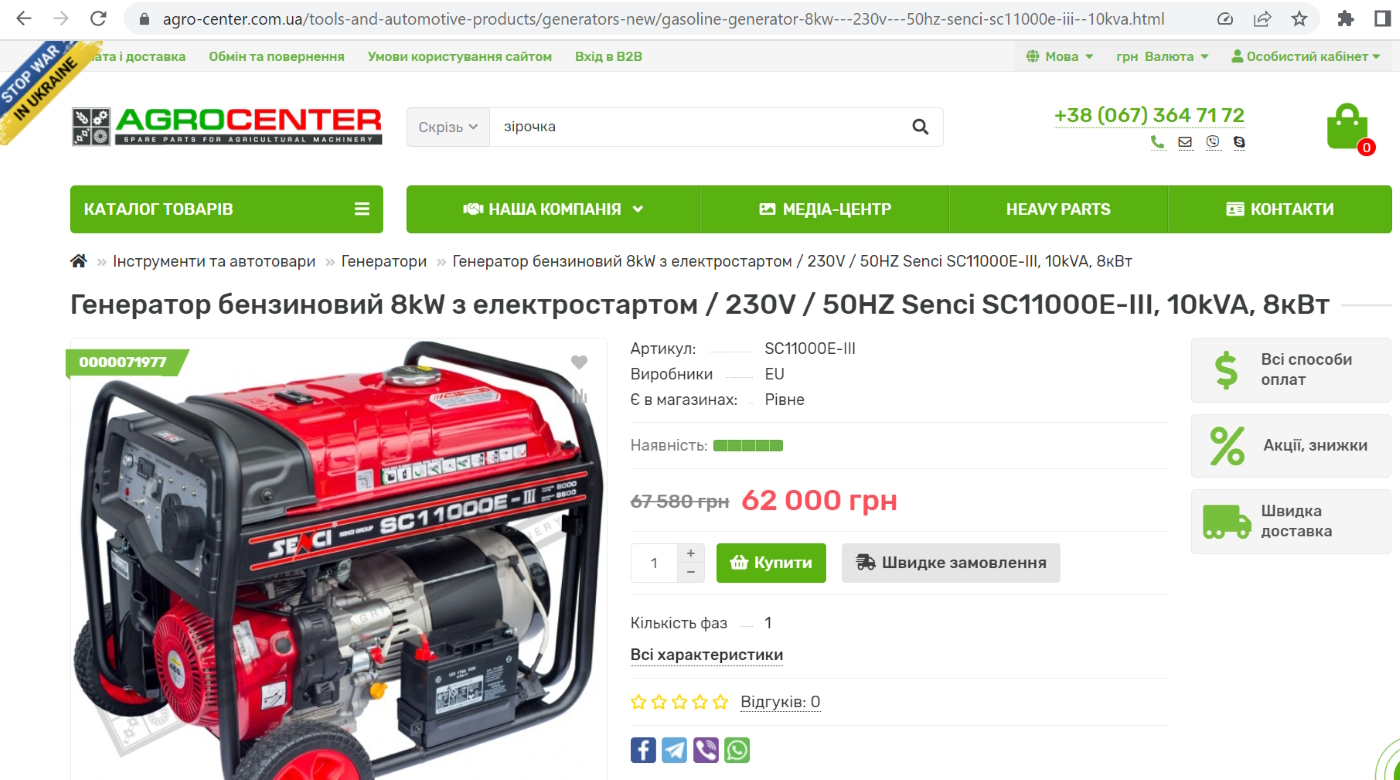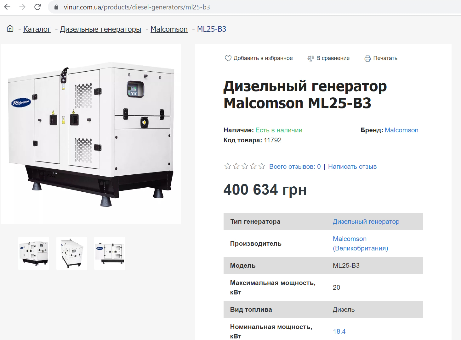 Решта генераторів дизельні й стаціонарі, але їх також немає в продажу. Наприклад, три штуки Global Techtop AS25S/B повною потужністю 23/25 кВА із номінальною напругою 400В/230В, паливним баком 80 л і витратою палива 4 л/год замовили по 680 тис грн, але нещодавно магазин в Рівному пропонував їх на 31% дешевше – по 520 тис грн.