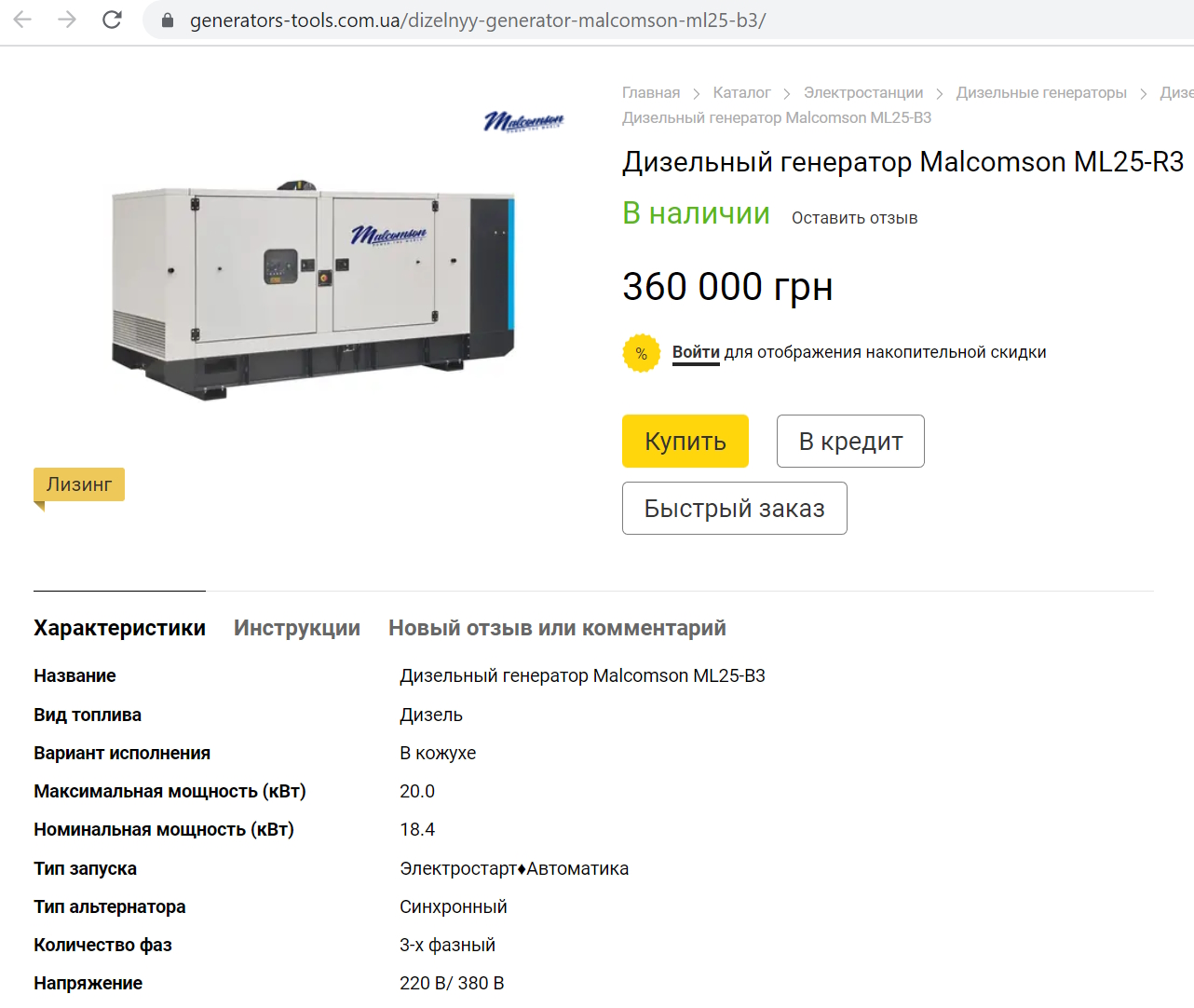 Повна потужність 23/25 кВА приблизно відповідає активній потужності 18/20 кВт. Зараз можна знайти у продажу дизельний генератор, наприклад, турецький пристрій від британського бренду Malcomson ML25-B3 активною потужністю 18,4/20 кВт із напругою 220В/380В за 360–401 тис грн. У нього бак на 45 л та витрата палива 4,9 л при навантаженні 100%.