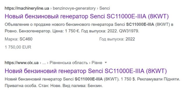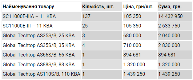 У Здолбунів поставлять 172 різні генератори китайського виробництва й найбільша сума у 14 млн грн іде на 137 мобільних бензинових генераторів Senci SC11000E-IIIA номінальною повною потужністю 11 кВА по 105 тис грн.