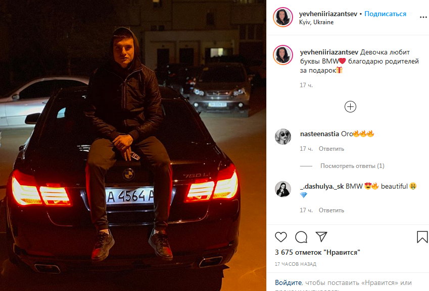 18-річний нападник молодіжного складу київського "Динамо" Євген Рязанцев розповів, що батьки подарували йому автомобіль BMW 750Li з об'ємом двигуна 4,4 літри.