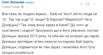 "Все-таки, як людині важко... Київ не "його" місто, люди не "їх". Так-так, а де "їх" люди? В Харкові? Маріуполі? Чи в Донецьку? Так чому вони зараз в Києві? До чого це скиглення і скарги? Зрозуміло що в його уявленні, постає Донецьк зразку 2013 року, та хіба він не розуміє що зараз Донецьк виглядає, м"яко кажучи, по-іншому. Хай їздить у Донецьк, подивиться, як там зараз, і можливо його туга трошки розвіється".