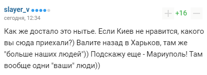 "Як же дістало це ниття. Якщо Київ не подобається, якого ви сюди приїхали?) Валите назад до Харкова, там же "більше наших людей")) Підкажу ще - Маріуполь! Там взагалі одні "ваші" люди))".