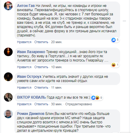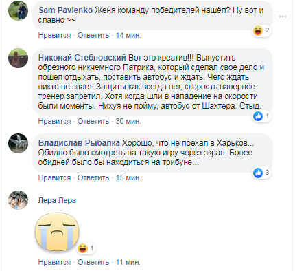 У соціальних мережах шанувальники "Шахтаря" пишуть, що команда не викладалася на всі 100%. Зокрема, деякі з уболівальників "гірників" незадоволені роботою головного тренера команди.