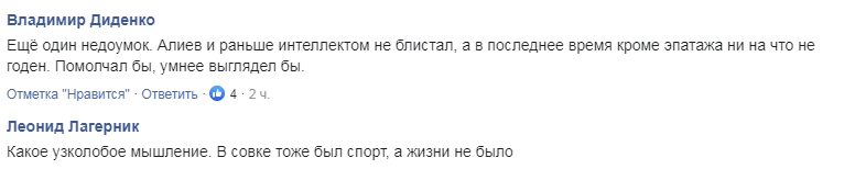 "Ще один недоумок. Алієв і раніше інтелектом не відзначався, а останнім часом крім епатажу ні на що не придатний. Помовчав би, розумніші виглядав би".