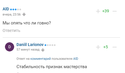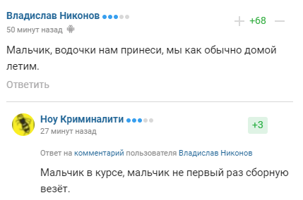 "Ця збірна - Росія в мініатюрі. Неефективна, відстала від прогресу, примітивна, консервативна, як хочете. З нахабним хамським ватажком, який в якості вираження своєї точки зору майже завжди використовує пасивну або активну агресію. З мінімальними по відношенню до витраченими на неї засобів досягненнями, а іноді і з фейковий досягненнями, типу ЧС-2018. і використовувала цей "результат" як пил в очі уболівальникам, як пропаганда використовує в своїх цілях такі "досягнення" як Кримський міст або Робот Федір".