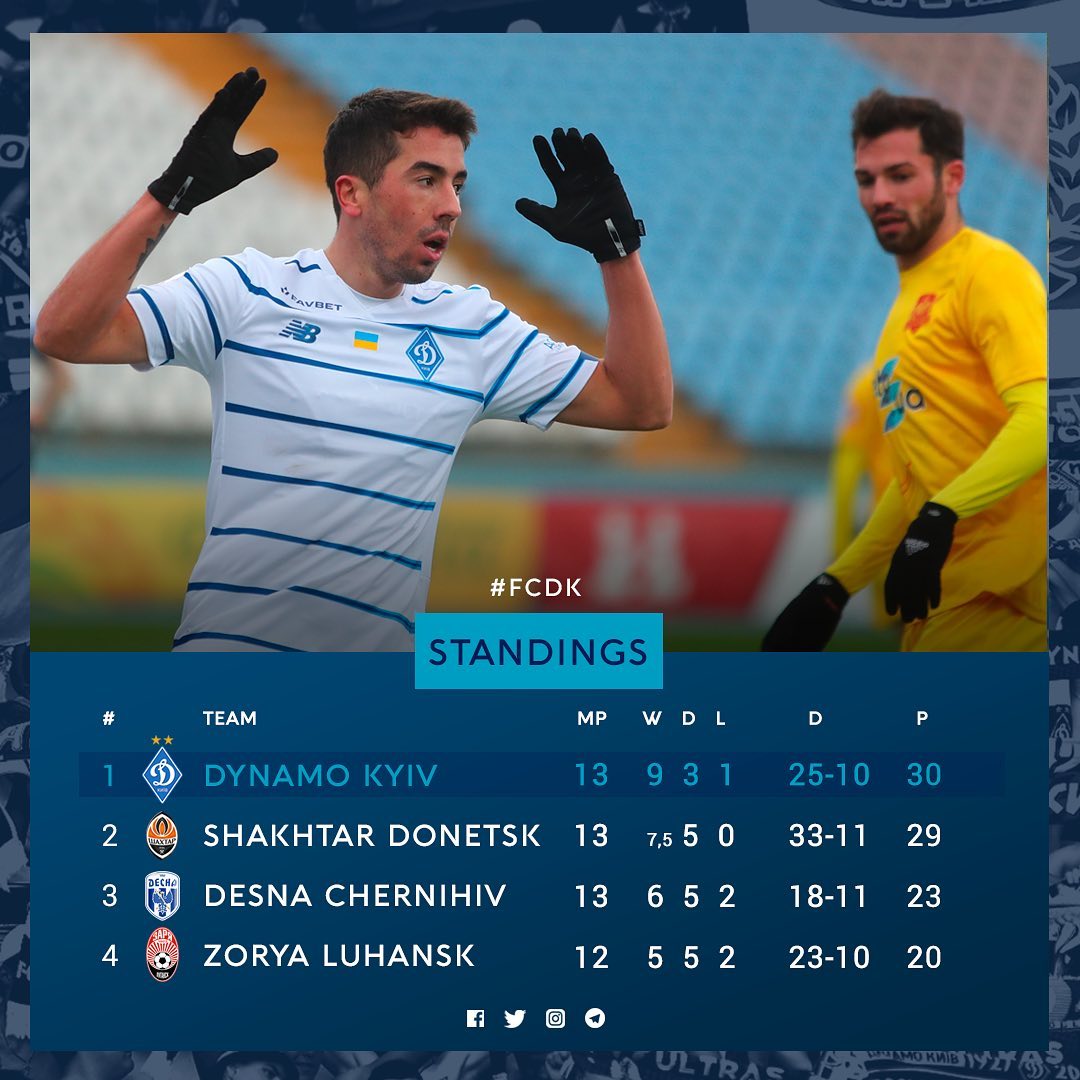 "Турнірна таблиця до середині лютого буде мати саме такий вигляд. P.S. "Шахтар" в "драматичному" матчі переміг "Інгулець" і зменшив відрив від киян до 1-го залікового пункту", - йдеться в повідомленні "Динамо".