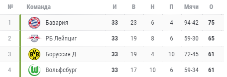 "Баварія", "РБ Лейпциг", дортмундська "Боруссія" і "Вольфсбург" гарантували собі путівку в Лігу чемпіонів. В останньому турі "Боруссія" і "Вольфсбург" в заочній боротьбі визначать володаря третього місця.