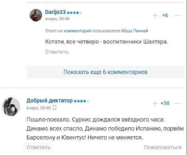 "Пішло-поїхало. Суркіс дочекався свого зоряного часу: Динамо всіх врятувало, Динамо перемогло Іспанію, порвемо Барселону і Ювентус! Нічого не змінюється", - коментують українці.