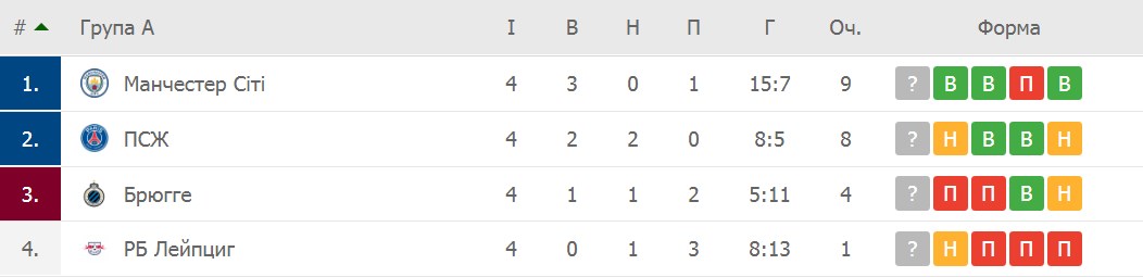 "Манчестер Сіті" вдома розгромив "Брюгге". Зустріч українців Олександра Зінченка та Едуарда Соболя відбулася лише за межами поля. Перший вийшов на заміну на 80-й хвилині, а другий з'явився у стартовому складі гостей, але залишив поле на 72-й хвилині. "Парі Сен-Жермен" не втримав перемогу над "РБ Лейпциг".