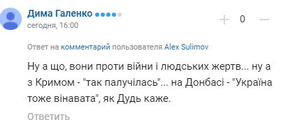 "Ну а що, вони (росіяни) проти війни і людських жертв. Ну а з Кримом - "так палучилось", на Донбасі - "Україна теж винна", як Дудь говорить".