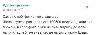 "Сама по собі фотка - не є зашквар. Шева - суперзірка і до нього 100500 людей підходить з проханням про фото. Якби не було підпису до фото, наприклад, я б і не знав, хто це на фото, окрім Шеви", - пишуть користувачі.