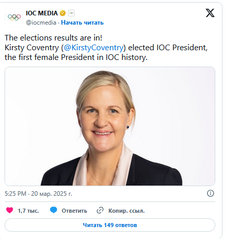 "Олімпійська чемпіонка із Зімбабве, плавчиня Кірсті Ковентрі, обрана президентом Міжнародного олімпійського комітету. Будемо стежити за її першими кроками. Попередній очільник, Томас Бах, вирішив залишити найбільш незручні питання щодо допуску/недопуску росіян у міжнародний спорт своїй наступниці", - написав він у Telegram-каналі.