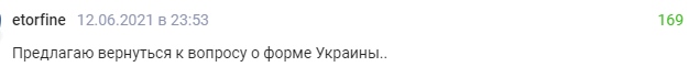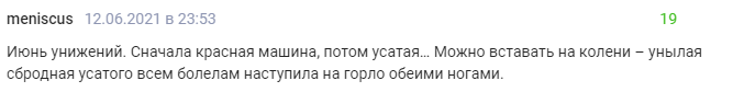 "Червень принижень. Спочатку червона машина, потім вусата ... Можна вставати на коліна - сумна сбродной вусатого всім фанатам наступила на горло обома ногами".
