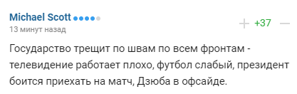 "Держава тріщить по швах по всіх фронтах - телебачення працює погано, футбол слабкий, президент боїться приїхати на матч, Дзюба в офсайді".