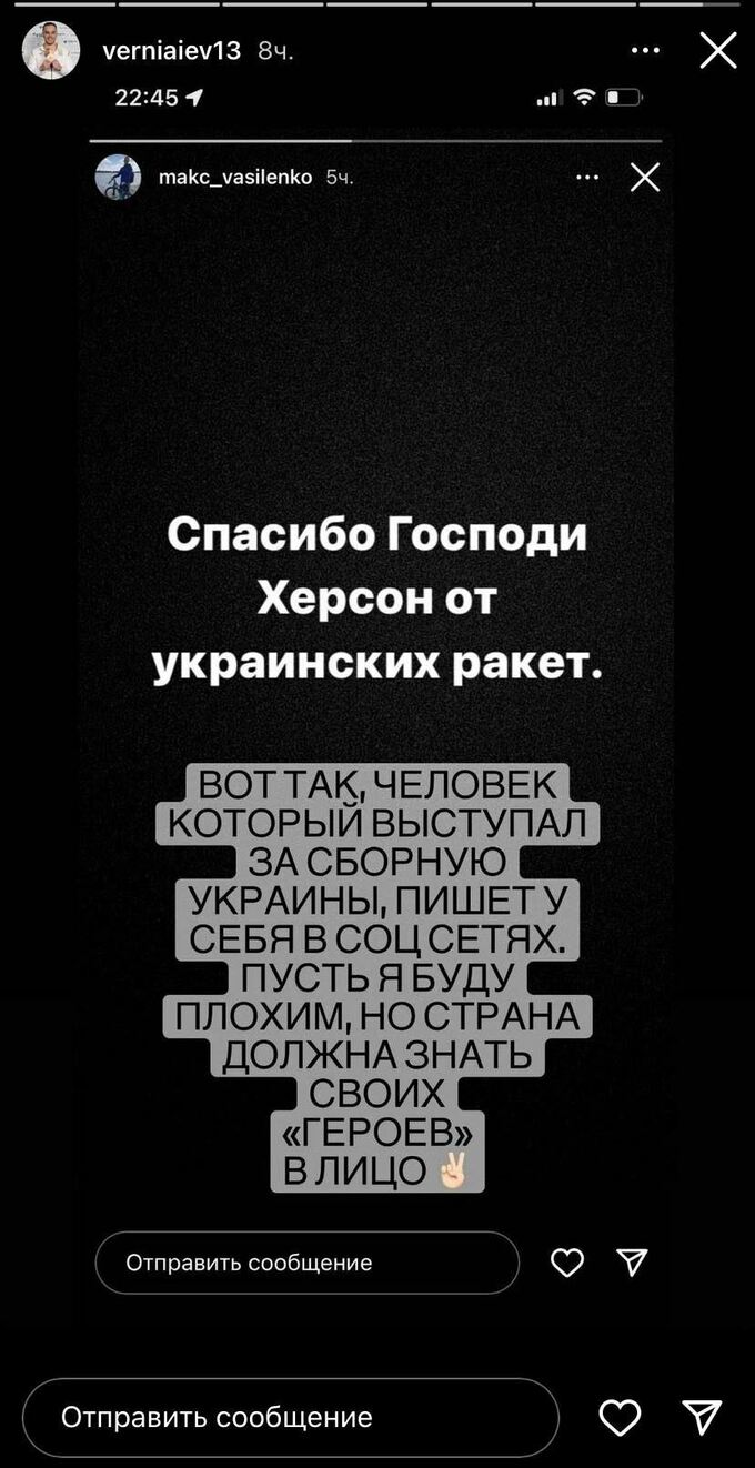 Титулований спортсмен опублікував у сторіс Instagram скріншот посту колишнього члена збірної країни, в якому той пише: "Врятуй Господи Херсон від українських ракет".