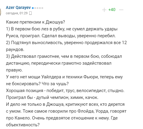 "Які претензії до Джошуа? 1) У першому бою ліз в рубку, не зміг тримати удари Руїса, програв. Зробив висновки, впевнено перебив. 2) Підтягнув витривалість, впевнено протримався всі 12 раундів. 3) Діяв грамотніше, ніж в першому бою, собоюдал дистанцію, періодично грамотно задіяв праву. У нього немає потужності Уайлдера і техніки Ф'юрі, тепер йому не боксувати? Що за нісенітниця? Гарна позиція - переможе, боягуз, велосипедист, соромно. Програв би - дутий чемпіон, хімік, качок. і справа не тільки в Джошуа, критикують всіх, хто б'ється з розумом. Теж саме говорили про Флойда, Уорда, кажуть про Канело. Дуже упереджене ставлення до нього. Де об'єктивність? ".