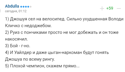 "1) Джошуа сіл на велосипед. Сильно погіршена Володі Кличка з недоджебом. 2) Руїз з пончиками просто не міг добігти і він теж накосячілі. 3) Бой - г-но. 4) І Уайлдер і навіть циган-наркоман ганятимуть Джошуа по всьому рингу. 5) Поганий чемпіон, скажімо прямо ... ".