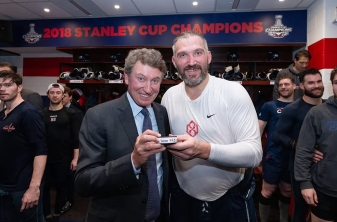 Овечкін зрівнявся з Грецкі за кількістю голів у регулярних чемпіонатах Національної хокейної ліги (НХЛ). Привітати особисто прийшов легендарний хокеїст з українським корінням Грецкі.
