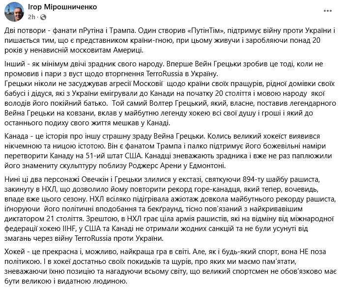 Колишній спортивний коментатор, політичний діяч Ігор Мірошниченко розкритикував хокеїста Вейна Грецкі, який ніколи не засуджував агресію РФ щодо країни своїх пращурів та підтримує наміри перетворити Канаду на 51-ий штат США.